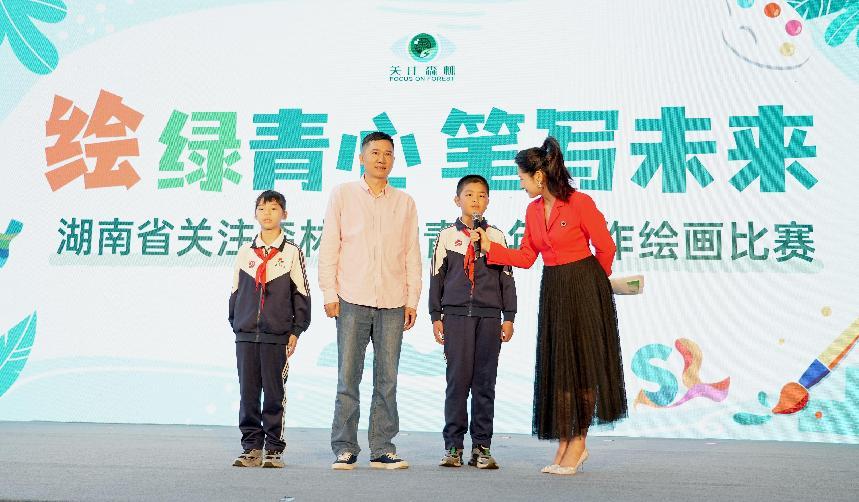 在“湖南省關注森林活動青少年寫作繪畫比賽”發布環節,長沙市望城區橋驛鎮維新學校學生代表胡錦煜、周哲豪與主持人互動,用童真視角詮釋森林的生態價值。知名兒童文學作家、《小溪流》雜志執行主編鄧湘子發出呼吁,鼓勵青少年積極報名參賽,盡情發揮想象力和創作力,用筆觸與色彩記錄生態之美。