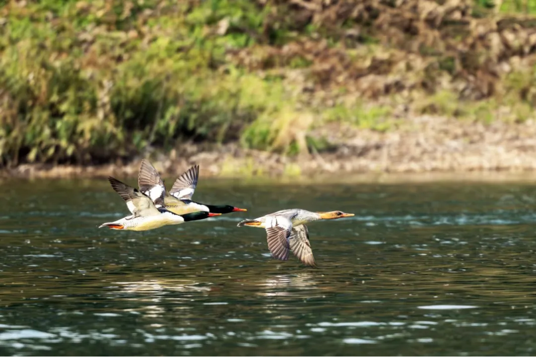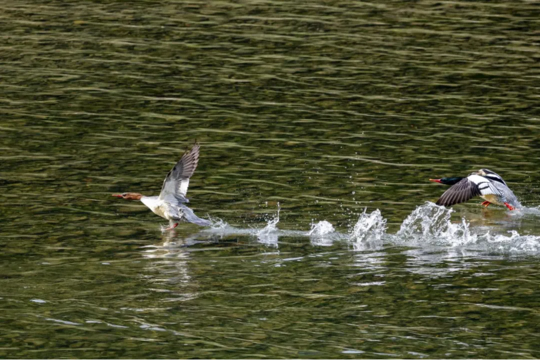 這4只中華秋沙鴨總是在2公里左右的淺水灘涂來回覓食,先順流而下捕食小魚小蝦,到深水區或遇到兩岸居民和游客渡河時又飛回上游,每隔一段時間會在遠離河岸和渡口的灘涂上歇息,在沒有干擾時一天會往返好幾個來回。與之相伴的還有五六只赤麻鴨,它們一起覓食、嬉戲,仿佛就是一幅靈動的畫卷。