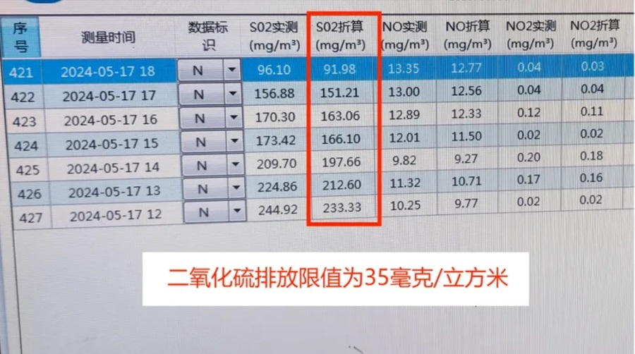 圖2 2024年5月18日,督察組現(xiàn)場督察發(fā)現(xiàn),婁底市冷水江鋼鐵有限責任公司高爐煤氣發(fā)電鍋爐二氧化硫超標排放